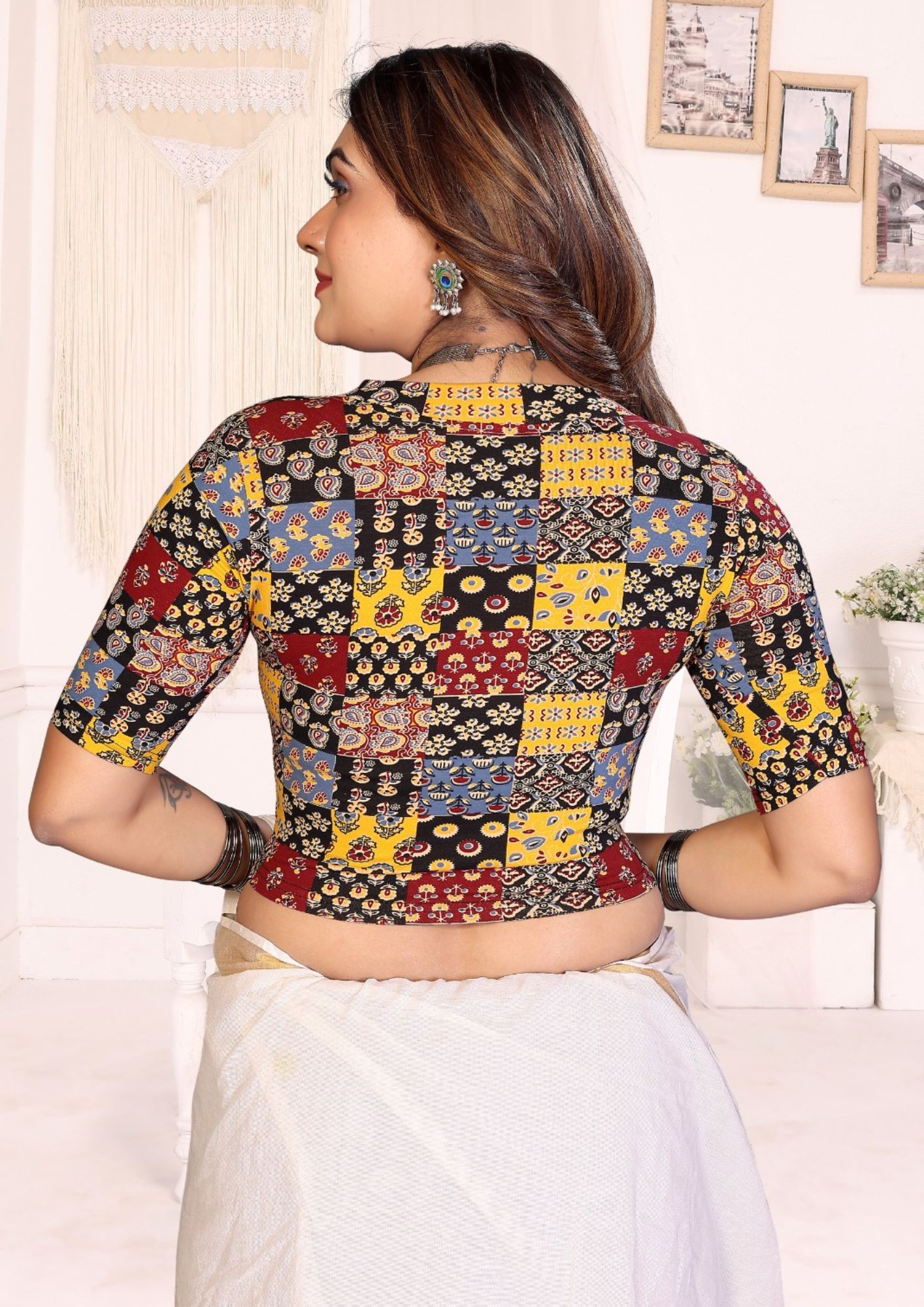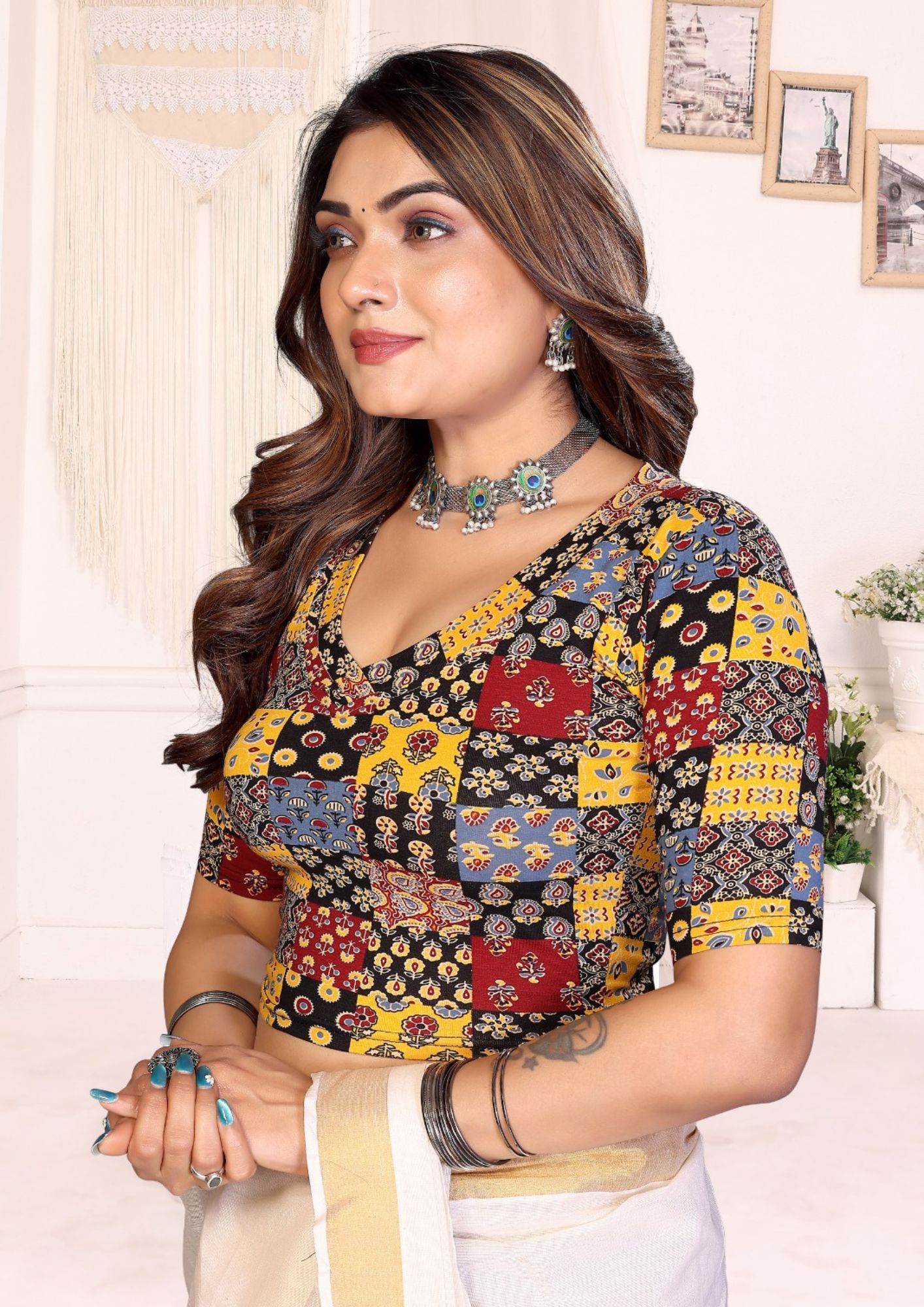 Upgrade your saree look with this premium cotton blouse blended with lycra for a comfortable, stretchable fit. Featuring elegant Kalamkari and Ajrakh prints with a flattering V-neck design, it’s perfect for festive and everyday ethnic styling.